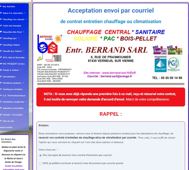 Cette attestation vous est due dans le cadre du contrat d’entretien que vous avez certainement souscrit et accepté pour vos différents types de chauffage, auprès de l’entreprise BERRAND sarl (voir les conditions générales du contrat).